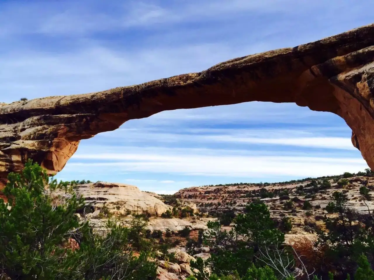 这座天然桥的形成,是经过基金霍斯河(也称跃马河)千万年的冲蚀后而成,最初是河水把坚固的岩石冲出了缝隙,使得湍急的河水不断地从岩石夹缝中破壁而出,然后再把巨大的岩石从底部向上渐渐掏空,最终使阻挡河道的一块巨大岩石,被冲刷成了一座形同桥状的“天然桥”。