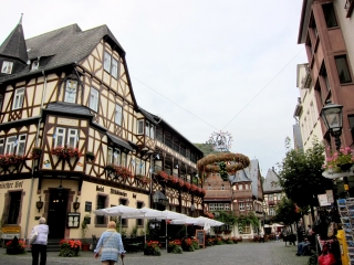 [吕德斯海姆] 酒乡吕德斯海姆坐落在河岸森林密布的缓缓的山坡上,满城都是重重叠叠的红色屋顶和绿树掩隐的街道,浸漫着花香,闪烁着阳光。小城的一切都是小巧而精致的, 小酒巷、小博物馆、小火车站、小日耳曼尼娅女神像—只有葡萄园是大片大片的。葡萄园随着季节的变幻而改变颜色,风光如画的村庄掩映在葡萄园中,每一处庄园 都是一个古老的故事。