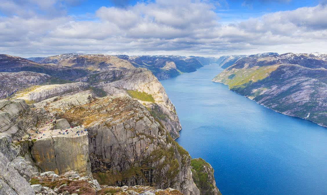 吕瑟峡湾位于挪威南部,全长 42 公里。吕瑟峡湾的入口是挪威西海岸的斯塔万格。河水在凸兀的峭壁和巍峨的群山之间蜿蜒流淌。两岸巨岩兀立,其中海拔600 米的断崖布雷凯斯特伦是最值得一看的地方。
