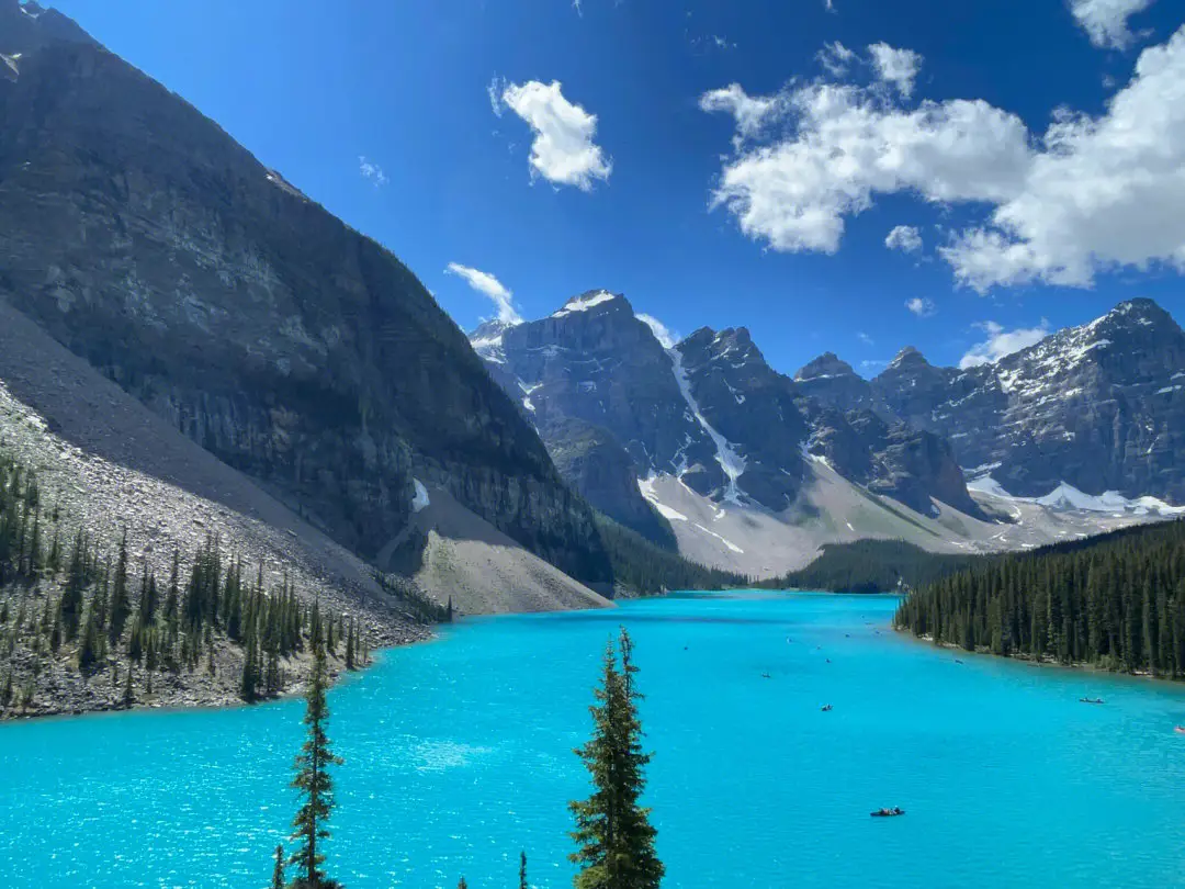梦莲湖是加拿大班芙国家公园的一个冰川湖,坐落在著名的十峰谷中,湖底积满了富含矿物质的碎石,经年累月的沉积形成了变幻多姿的碧蓝色湖水,被公认为是世界上最有拍照价值的湖泊,湖面呈宝石蓝色,晶莹剔透,像是一颗璀璨的明珠。