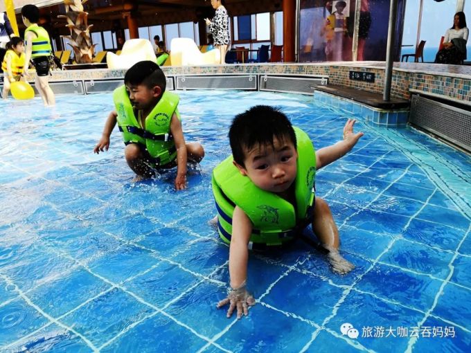 需要提醒的是,海上海风很大,即使海面上晴天出着太阳,一旦离开泳池,必须立刻做好保暖工作。我第一次带着云吞宝宝上邮轮时,当时13月龄的宝宝就是因为在邮轮上游泳,没有立刻做好保暖,导致当晚就发高烧了。