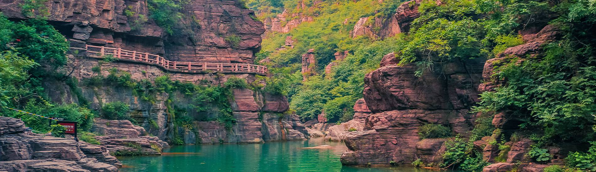 洛阳Luoyang 展开全长1.5公里,穿行在红色岩石和碧绿溪水之间,欣赏瑰丽的丹霞地貌峡谷景观
