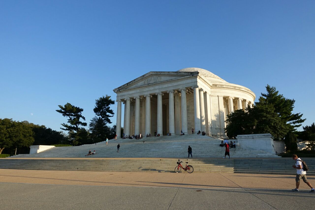 杰斐逊纪念堂位于华盛顿潮汐湖边,是为了纪念美国第三任总统托马斯·杰斐逊而建的,并按照杰斐逊最喜爱的古罗马神殿式圆顶建筑风格设计,与华盛顿纪念碑隔湖相望。每年4月,湖畔的樱花盛开,环绕通体洁白的纪念堂,美不胜收。