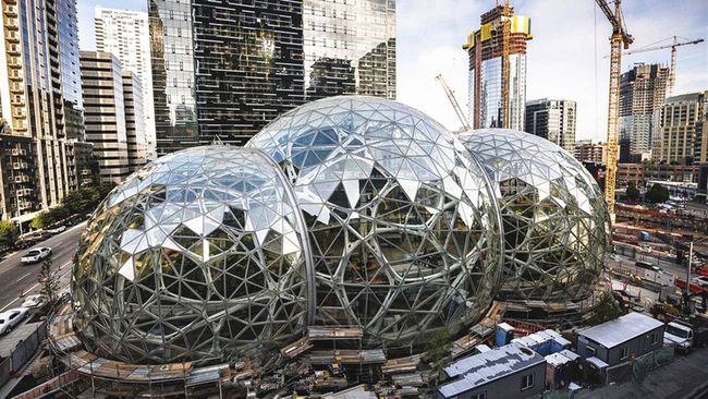 为了体现亚马逊公司热带雨林氛围,给员工创造更舒适的工作环境,亚马逊在西雅图市中心的总部建了三颗彼此相连的玻璃球型温室。这三个依偎在一起的大玻璃球,一建成就成了西雅图的重磅打卡地标。