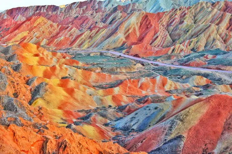 以颜色五彩斑澜而著称,数以千计的悬崖、山峦呈现出鲜艳的丹红色和红褐色,特别是在阳光的照耀下,各处造型奇特的山地丘陵色彩斑斓、气势磅礴。张掖丹霞景区还是张艺谋的电影《三枪拍案惊奇》、知名电视剧《神探狄仁杰》的外景地。红、灰、白、青、紫、灰黑、灰蓝,曼妙多姿的色彩就在你的脚下,在阳光的照耀下更是绚烂多彩,七彩的山峦冲击着你的视觉,让你体会到西部独有的荒凉和壮美。
