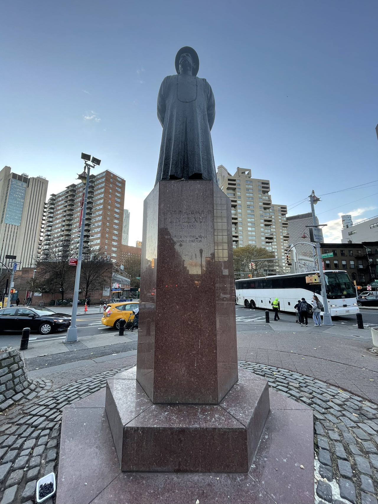 纽约林则徐铜像由美国林则徐基金会于1997年——香港回归祖国的同一年,树立在纽约市华埠中心,东百老汇街的前端。为了让世人,特别是香港同胞能够了解鸦片战争的历史真相,了解震惊中外的“虎门销烟”,为了弘扬林则徐的反毒、禁毒和救国拯民的崇高精神,也为了团结全世界的炎黄子孙,提醒普天下的华夏儿女应该牢牢记住鸦片战争是中国近代耻辱史的开端。在接近新旧世纪交替,九七即将逼近的一九八九年,由基金会主席黄克锵构思在美国纽约华埠树立林则徐铜像。
